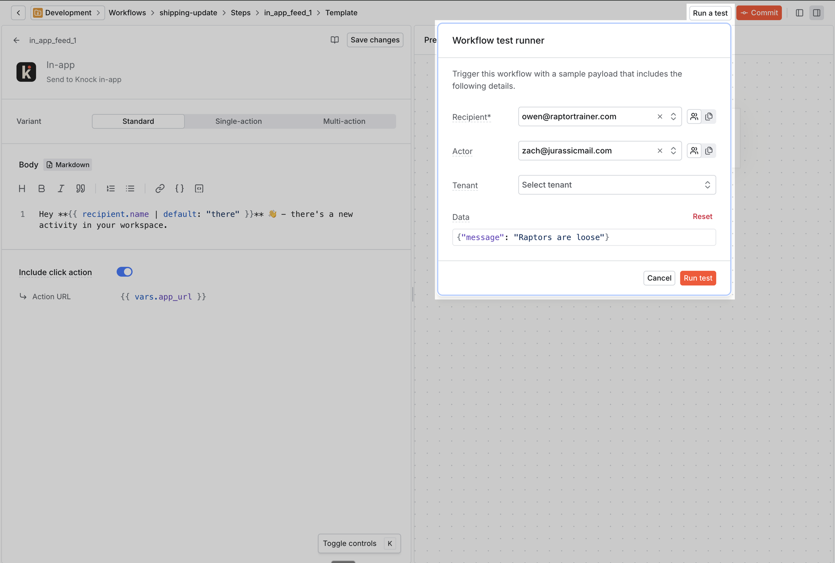 Now, you'll trigger your workflow to a user and produce a notification in the feed. You can do that through the test runner in the workflow editor, or via API call. Your recipient should be the id of the user we identified in our Inbox component.